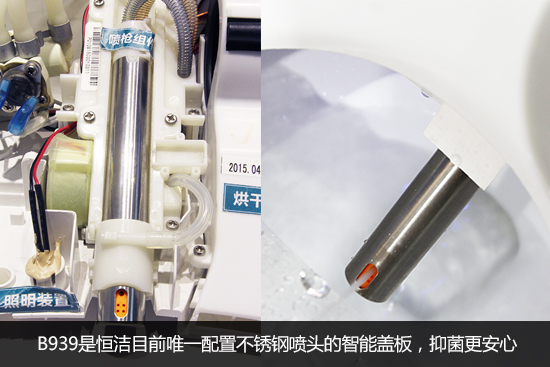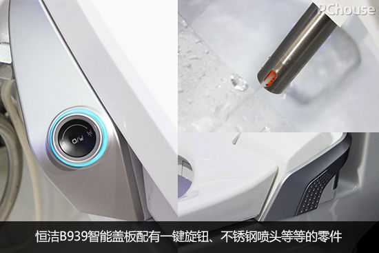 恒洁B939智能坐便盖板配有LED七彩旋钮、不锈钢喷头、遥控红外接收和高抗菌自洁程度高的盖板。