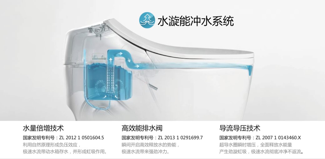 拥有「国家发明专利」头衔的水漩能冲水系统,技术相当扎实,采用低水箱设计,但冲水动力却相当「猛」,让HZ800A智能马桶即使只用4.8升水,也能“刷”地一下冲得干干净净,完美兼顾节水与强劲冲力。