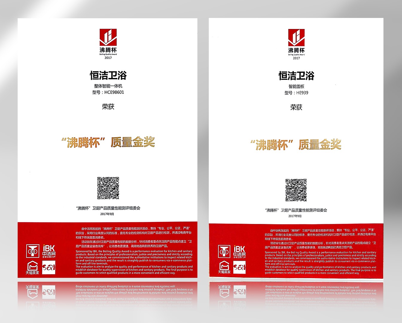 2017也是恒洁智造的「沸腾年」。在有国内外42个品牌,63个型号的智能坐便器参与的首届沸腾杯智能坐便器测评中,恒洁智能卫浴产品在节能、安全、舒适、耐用性四项测评中数据全面领先,分别摘取智能一体机及智能盖板质量金奖。