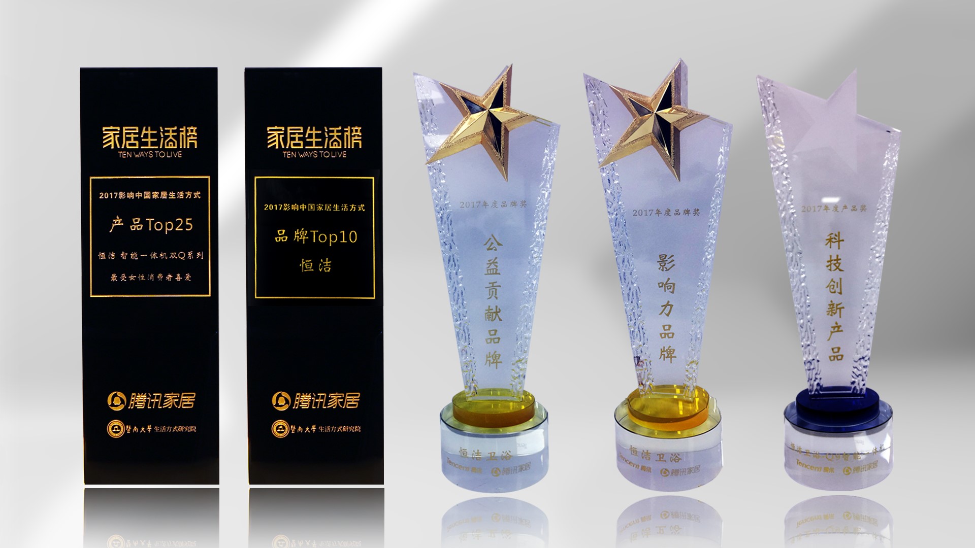 在2017中国家居产业品牌创新峰会暨腾讯家居年度颁奖盛典上,恒洁以卫浴行业唯一上榜品牌身份斩获含金量最重的2017影响中国家居生活方式-TOP10品牌大奖,并一起打包了以下奖项:
