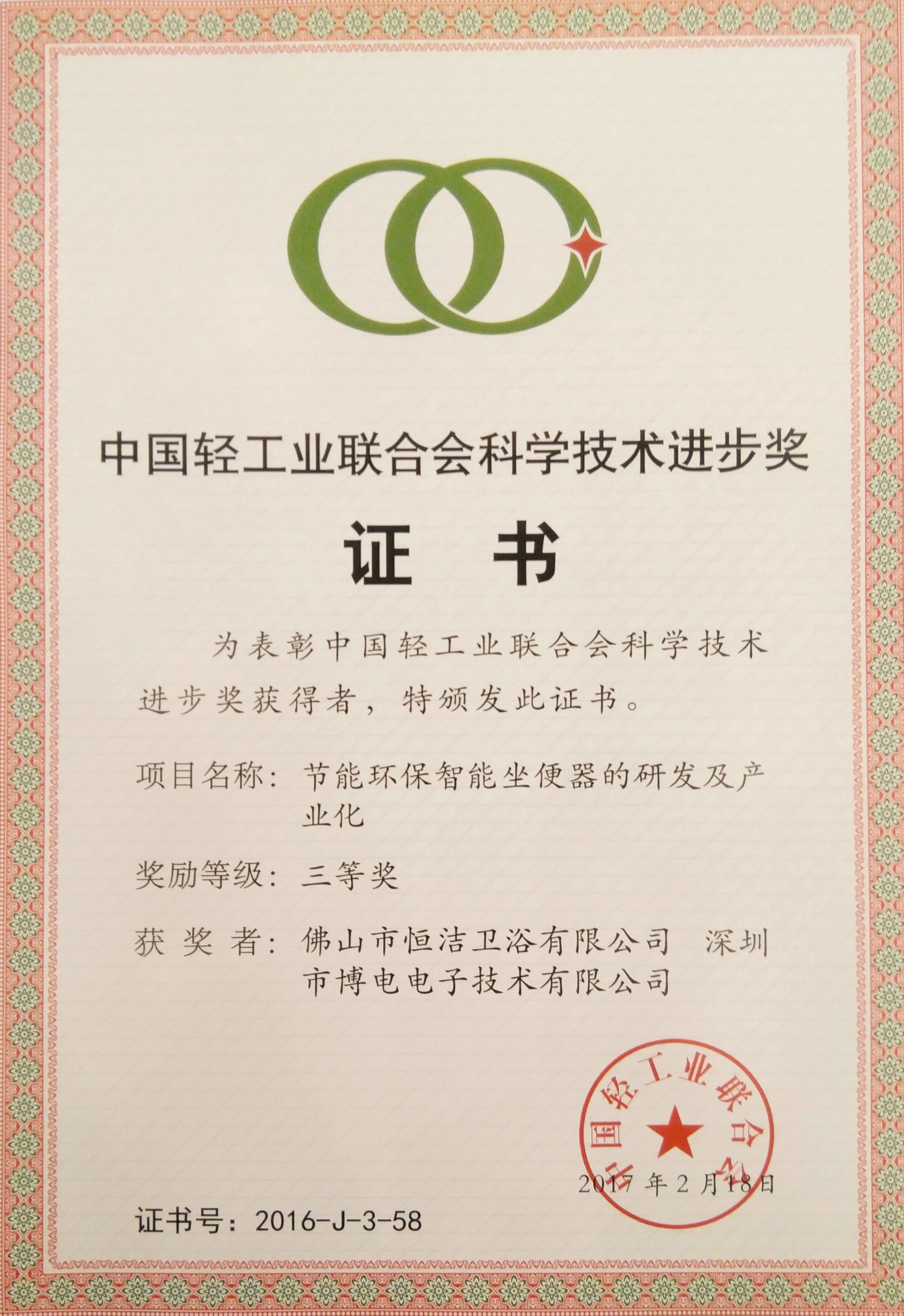 在2017年年初,恒洁以「节能环保智能坐便器的研发及产业化」项目,荣获中国轻工业联合会颁发的中国轻工业联合会科技进步奖。该奖项代表了中国轻工行业技术奖励的最高级别,标志着恒洁智能坐便器在高效节能卫浴市场成为了国家专家团队力挺的主力军。
