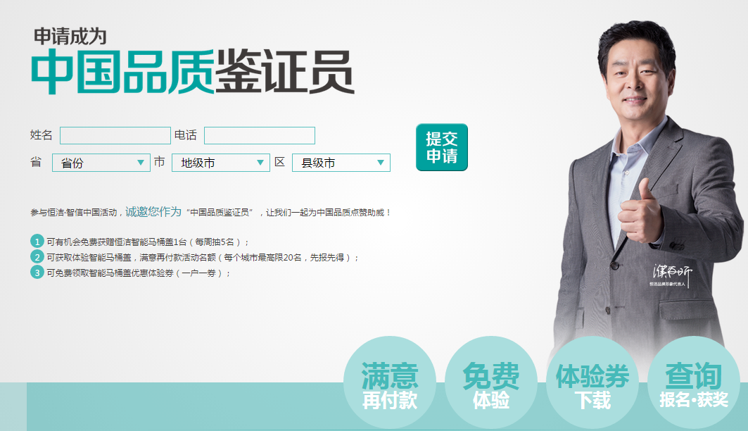 值此行业盛会,恒洁卫浴将会在发布会上发起“智信中国”活动——在全国范围开展“满意再付款” 恒洁智能马桶盖体验活动,并在全国招募“中国品质”鉴证员。恒洁期望权威媒体专家能率先体验并影响消费者感受中国一流企业的中国智造、建立对中国品质的信 心,同时以优质的中国品质产品回馈广大消费者。