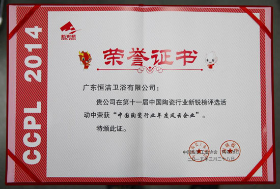 图为恒洁荣获“中国陶瓷行业年度风云企业”证书