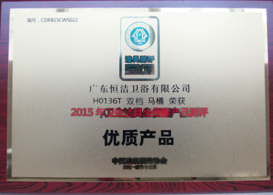 恒洁H0136T双档马桶获得坐便器产品测评优质产品大奖