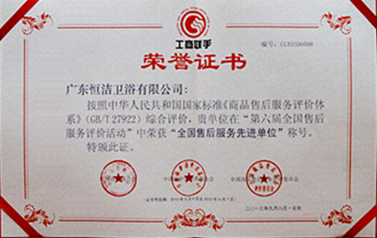 凭借“1350阳光服务体系”,恒洁卫浴被授予“全国售后服务先进单位”称号。