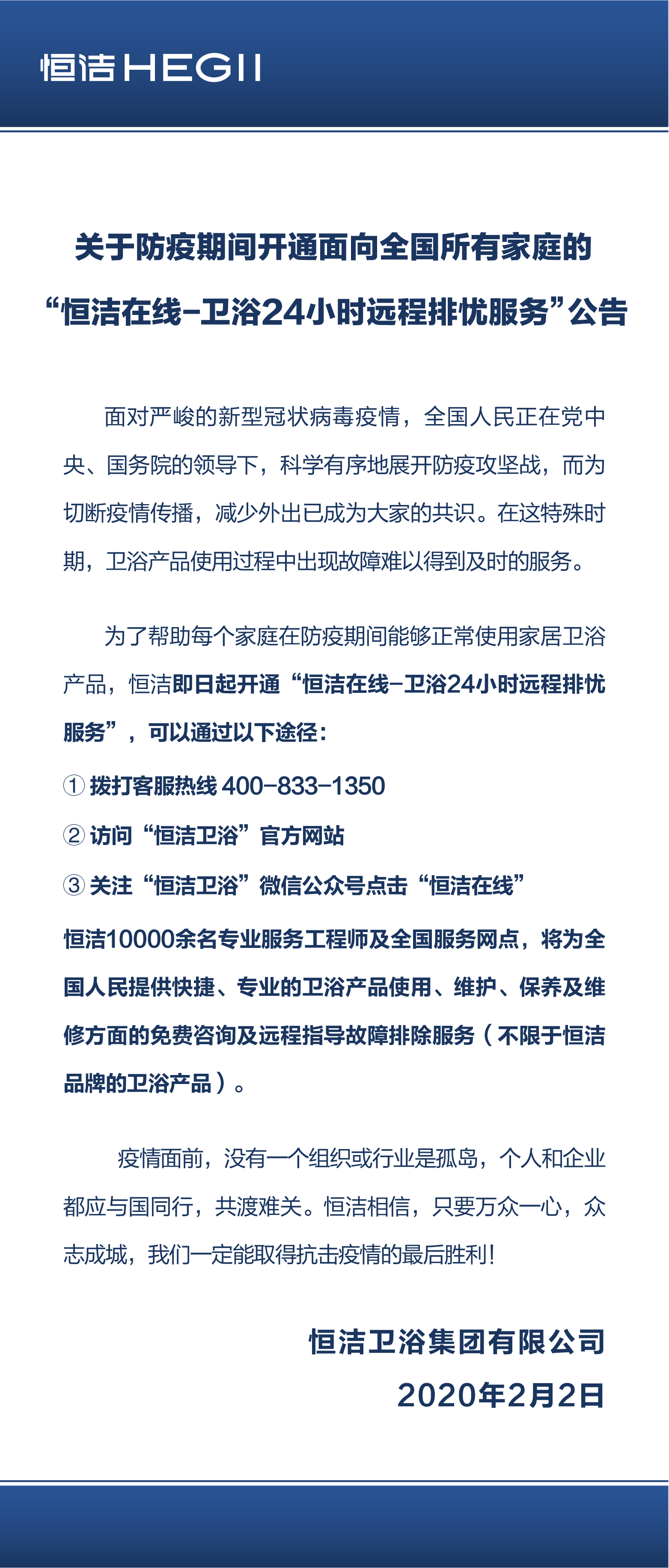 为了帮助每个家庭在防疫期间足不出户能够正常使用家居卫浴产品,恒洁集团组织专业力量,自2020年2月2日起,面向全国所有家庭开通“恒洁在线-卫浴24小时远程排忧服务”,在防疫期间为全国广大人民群众的“坚守不外出”提供全天候卫浴产品售后免费咨询及远程“排忧”服务(不限于恒洁品牌产品):