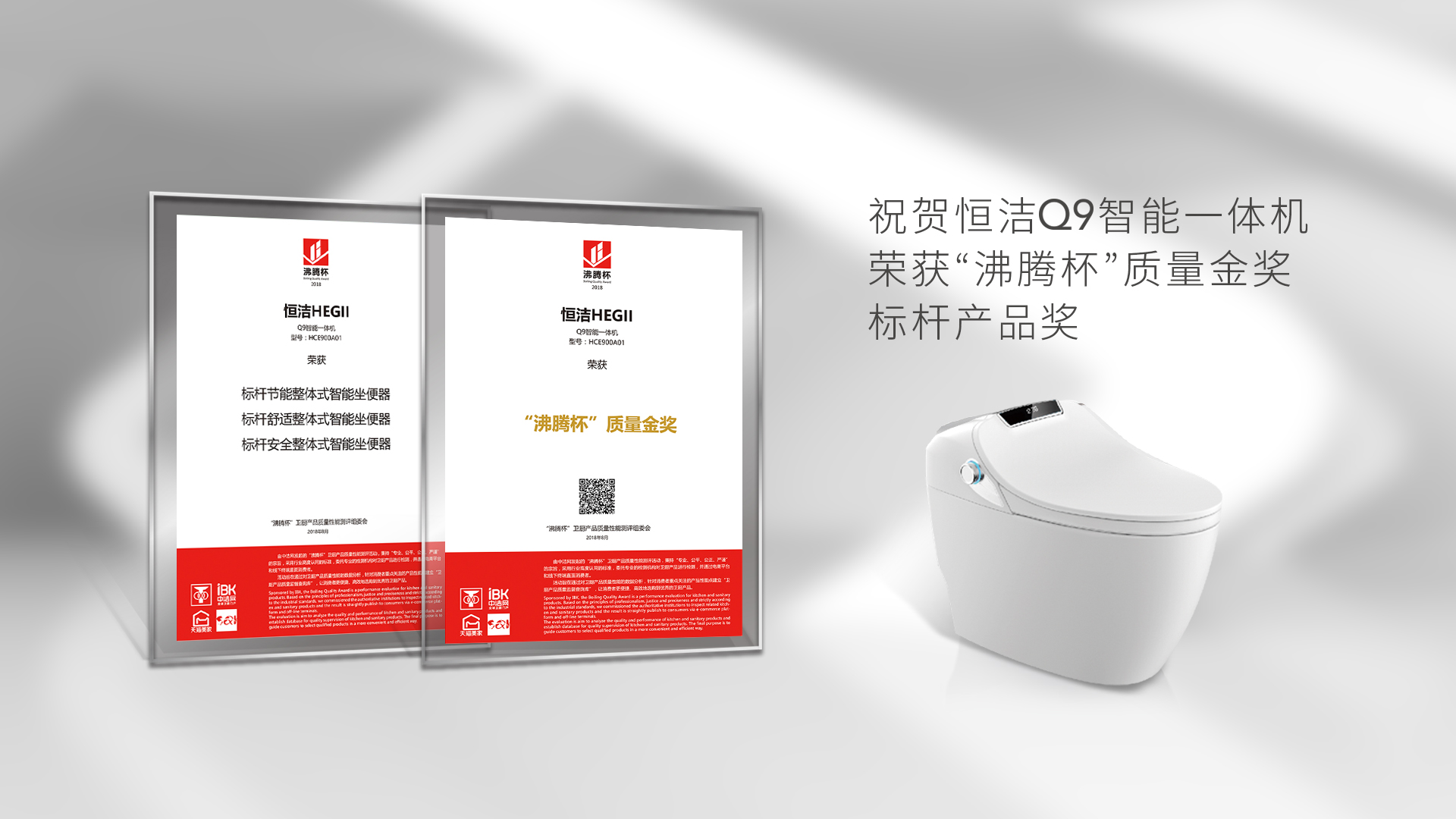 恒洁Q9、Q8Plus智能一体机凭借领先的智能核心科技和卓越的产品性能,一举拿下综合测评最高奖「质量金奖」及多项标杆大奖,这是继恒洁智能双Q坐便器荣获首届「沸腾杯」最高奖之后,再次获得此殊荣,彰显无可撼动的品质实力!