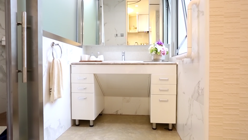 恒洁卫浴作为设计师选用的品牌,在了解了委托人的特殊情况后,为小李量身定制浴室柜,其镜面有5度角的斜度,可以给轮椅使用者看到全身,同时也不影响普通人的使用,台面下沿距离地面680mm,保证轮椅使用者的腿部有足够的空间。