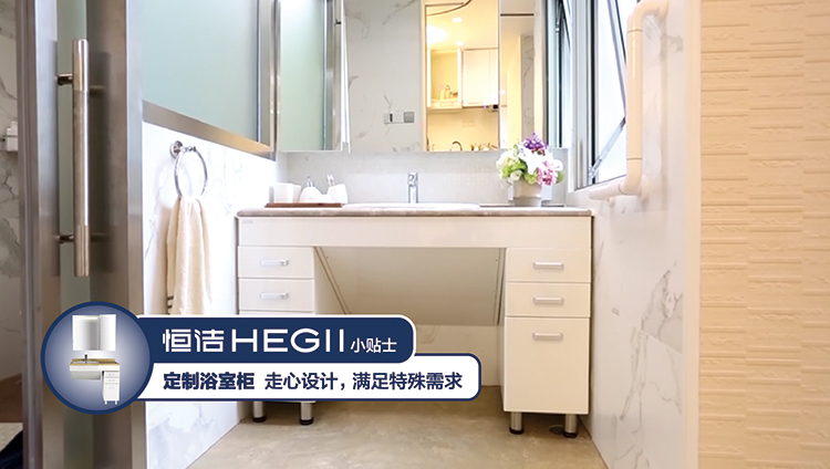 恒洁卫浴作为设计师选用的品牌,在了解了委托人的特殊情况后,为小李量身定制浴室柜,其镜面有5度角的斜度,可以给轮椅使用者看到全身,同时也不影响普通人的使用,台面下沿距离地面680mm,保证轮椅使用者的腿部有足够的空间。