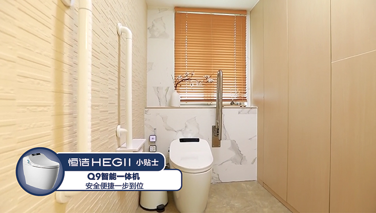 恒洁智能Q9坐便器同样也为母子二人提供了便利,其独有的一键旋钮设计,让操作化繁为简,无需弯腰转身,方便行动不便者进行操作;其接近感应功能,靠近盖板便会自动翻开,给予贴心的使用体验。此外坐便器搭配的U型扶手,更是便于小李在未来也能独自上厕所。