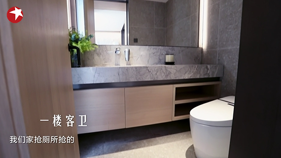 一楼的客卫避免了一家人今后抢厕所的尴尬,选用的恒洁Q8智能一体机,其独有的一键旋钮设计,每次使用时都无需重复设定,仅用一键旋钮就能完成水洗、烘干、清洗的个性化使用体验,方便汪先生一家无论是老人还是小孩轻松操作。此外坐便器的活水即热功能,让全家人到了冬天也无需担心冰冷,即开即热,水温恒定,不再忽冷忽热。