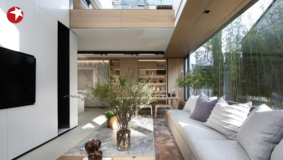 由于老宅的北墙和西墙都与邻居紧紧相邻,加之周围邻居都加盖了二楼,只有东墙可以采光,于是设计师在客厅东墙选用了一块长4.7米、宽2米,重达半蹲的超大玻璃窗,其充分引入了自然采光,使整个室内更加明亮、柔和。