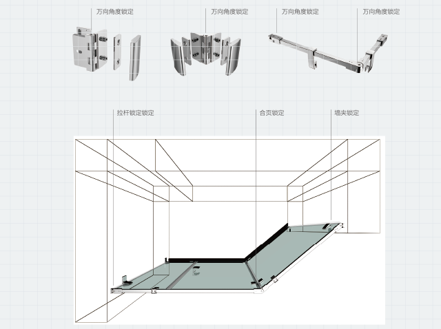 万向调节系统设计合页、墙夹、拉杆整体系统均可多角度锁定,完美解决石基预埋角度不规则,墙面不垂直等一系列现实问题,让非标淋浴房定制无极限。
