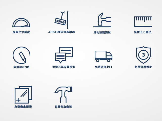 设计安全每套产品从设计之初,我们在结构上、在每一片玻璃的开孔与固定上就全方位的考虑到您的安全,我们要求所有的产品都经过超大、超宽、超窄、45KG横向撞击等多项测试,我们对每一片玻璃都进行全钢化并安全覆膜保护,确保产品结构牢固并经得起外力和时间的考验。