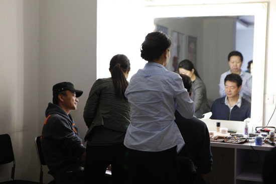 和工作人员寒暄毕,濮老师安静地坐在化妆间。这一刻的濮存昕老师没有舞台上李白的狂傲,也不是《三国之见龙卸甲》中那个非主流的诸葛亮,更非《建筑师》里那个空灵深邃的索尔尼斯——坐在你身边的就是我们熟悉的,温润如玉的熟男,可以一边“温顺”地配合化妆师的“摆弄”,一边和导演沟通拍摄细节。这个被北大荒凌冽的寒风吹刮过的文艺中年,虽然已经是中国戏剧界数一数二的腕儿,但仍深深懂得尊重普通工作人员的劳动价值,不急不躁心存虔敬。
