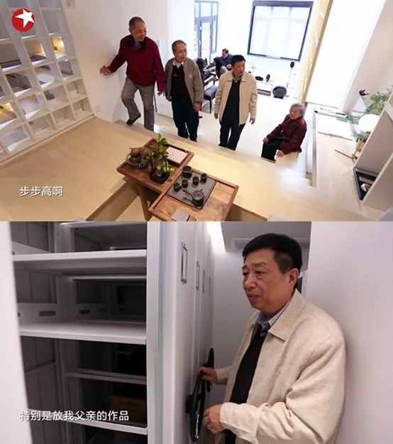 对于改造冯老太太最为关心的,便是已逝丈夫留存下来的书画、手稿等物品。设计师为此特在二楼设计了一个纪念空间,不仅提供了大量的储物空间,还引入了图书馆式密集柜,满足了这家人大量区域进行藏书和藏画。