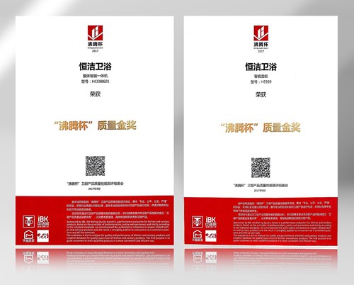 2017也是恒洁智造的「沸腾年」。在有国内外42个品牌,63个型号的智能坐便器参与的首届沸腾杯智能坐便器测评中,恒洁智能卫浴产品在节能、安全、舒适、耐用性四项测评中数据全面领先,分别摘取智能一体机及智能盖板质量金奖。