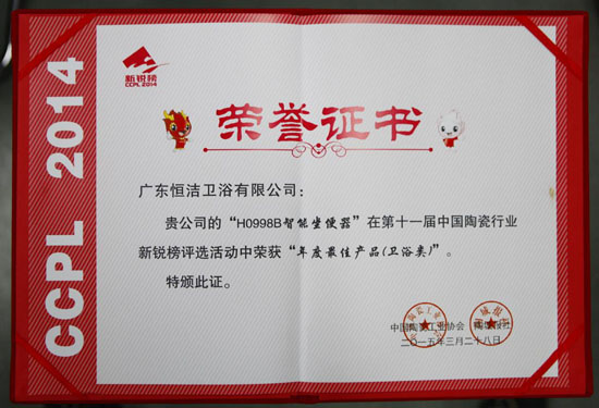 图为恒洁智能马桶荣获“年度最佳产品”证书