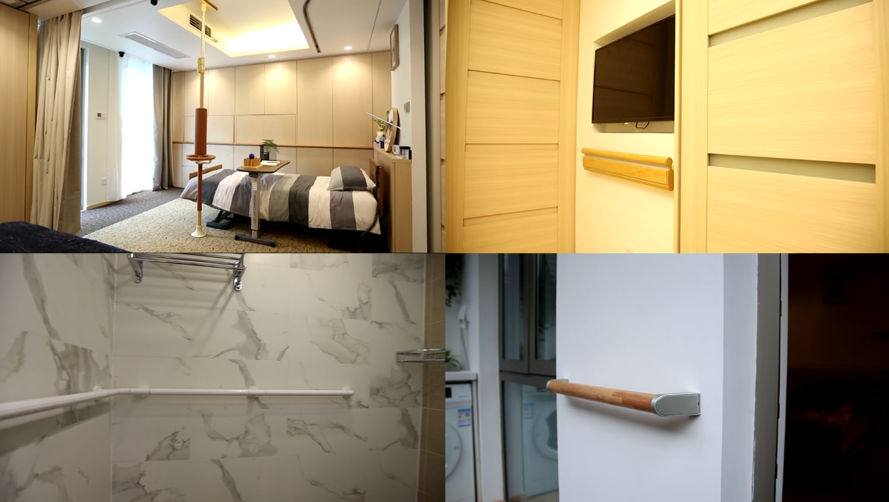 为了减轻儿子小李摔倒后受到的伤害,设计师通过支脚架空地板,地板下有了空间就会变得更有弹力。屋顶设置的天花导轨也暗藏玄机,这是设计师考虑到将来小李无法下床进行洗漱,上厕所而铺设的线路,配合天花位移器使用,可帮助小李自由来往于卧室和卫生间,很大程度上提升了小李自理生活的能力,也大大减轻了妈妈照顾小李的负担。