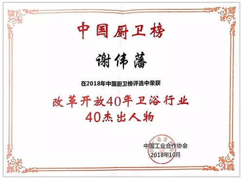 恒洁卫浴凭借强大的企业综合实力及品牌影响力,从众多企业中脱颖而出,荣获「改革开放40年卫浴行业40强企业」,董事长谢伟藩荣膺「改革开放40年卫浴行业40杰出人物」,彰显行业领军品牌风范!