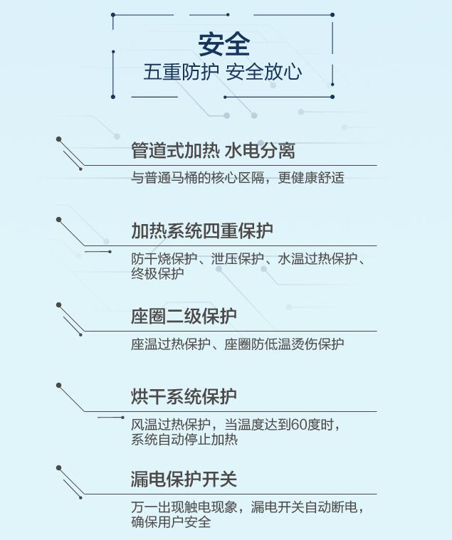 目前智能坐便器的质量问题集中在耐燃、耐压、防漏、标识等方面,尤其是其水电结合的特质,器具渗水、漏水容易导致短路。恒洁卫浴把安全防护功能当作智能坐便器产品的重要性能,通过采用更安全的水电分离技术,既可迅速加热,又起到保护和绝缘的作用;阻燃、防潮、防超温、防超压、防干烧等保护装置,杜绝安全隐患。