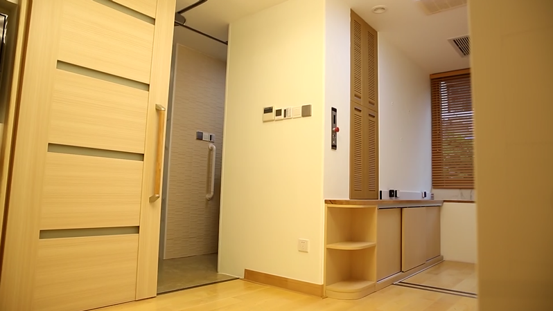 对于卫生间,是本间贵史考虑的重中之重,由于小李将来要使用轮椅车,在其身边还需要有人看护,设计师将卫生间扩大到了9平方米,不仅做到了干湿分离,更是被细致的划分为淋浴区,盥洗区,如厕区。