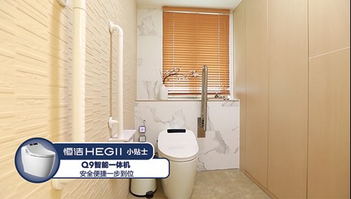 恒洁智能Q9坐便器同样也为母子二人提供了便利,其独有的一键旋钮设计,让操作化繁为简,无需弯腰转身,方便行动不便者进行操作;其接近感应功能,靠近盖板便会自动翻开,给予贴心的使用体验。此外坐便器搭配的U型扶手,更是便于小李在未来也能独自上厕所。