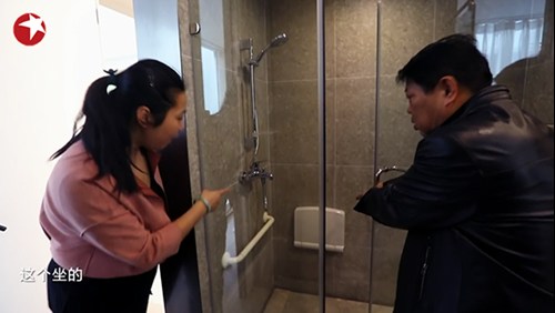 主卧卫生间起到干湿分离作用的恒洁淋浴房,小空间更通透,其中的恒洁双功能明装淋浴大花洒,具备升降杆配置,可以根据使用人的身高自行调节手持高度,让汪老先生无论是站着或是坐着洗澡都能轻松适应,花洒手持多种出水方式,可满足不同人群的淋浴需求。