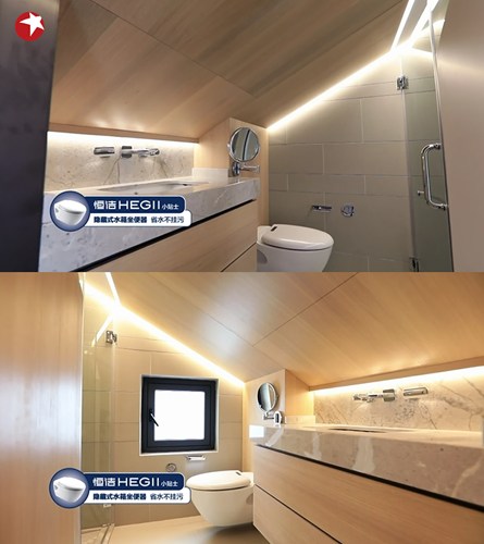 在二楼,设计师巧妙地利用了斜坡屋顶,在层高不够的地方为两间套房各打造了一间卫生间,方便女儿一家四口的洗漱。恒洁的隐藏式水箱坐便器,在其中更加节省了卫生间的空间,更显美观。