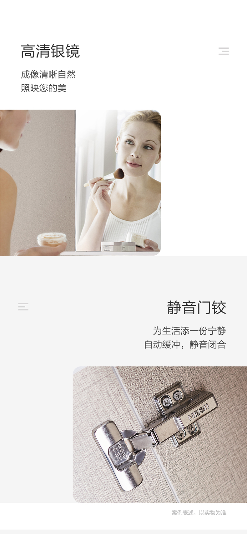 - 木合金柜体,防水防潮,随心安放;表面覆膜工艺,3D触感, 温润如木;