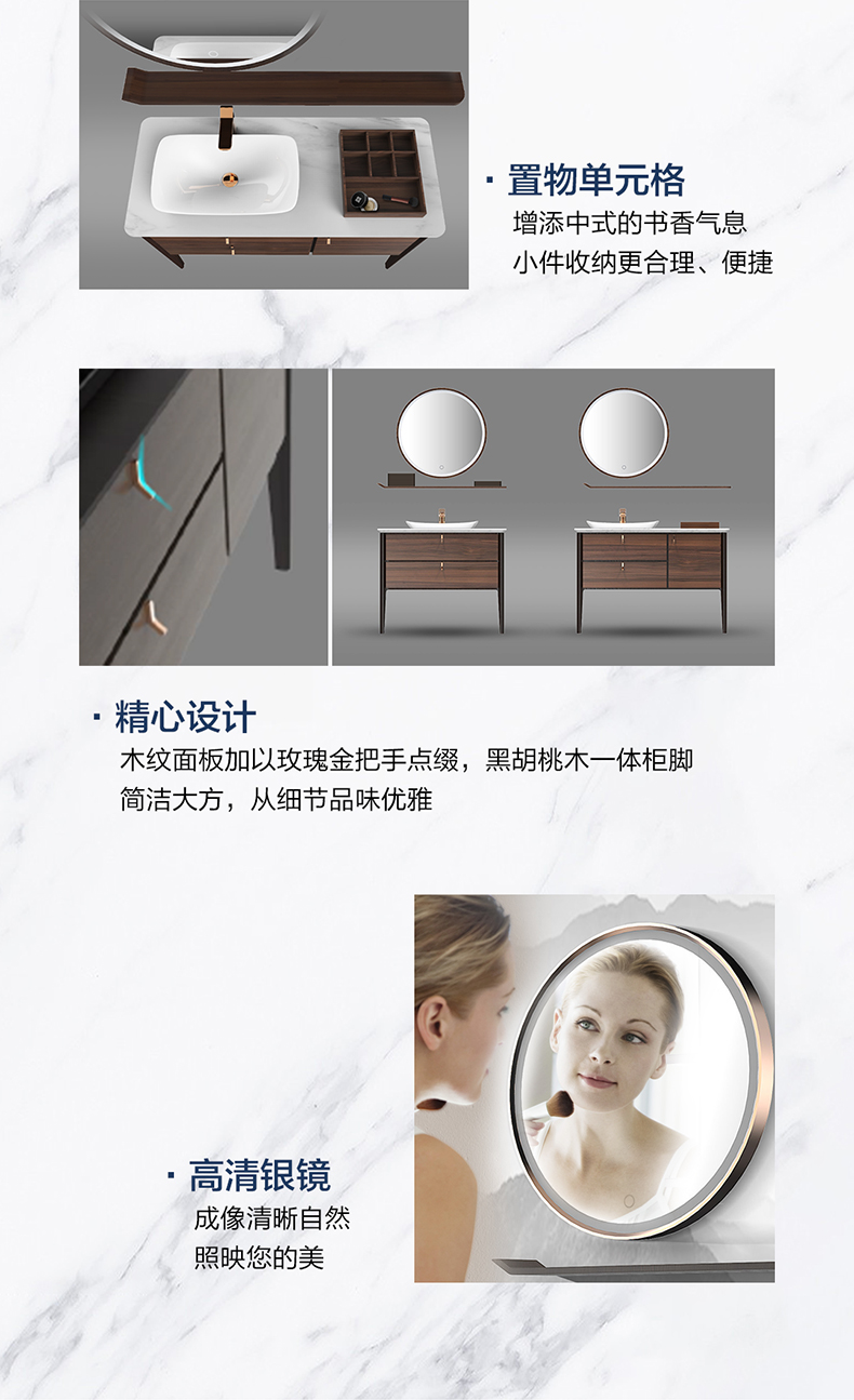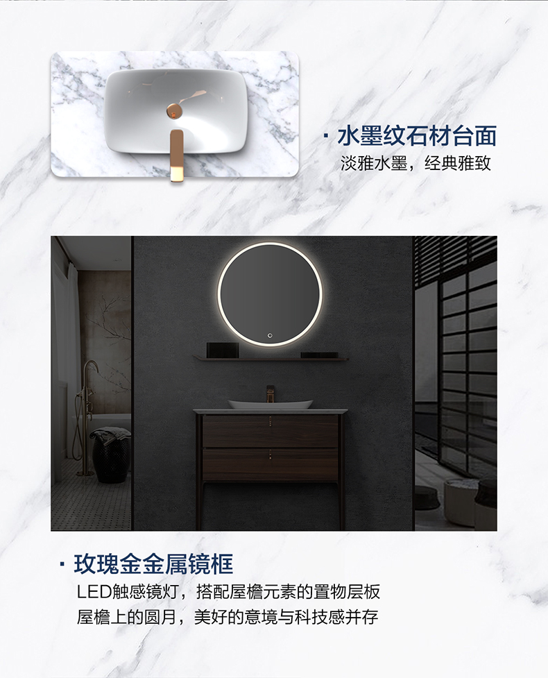 - 玫瑰金金属边缘 + LED触感镜灯,创新设计与科技感并存