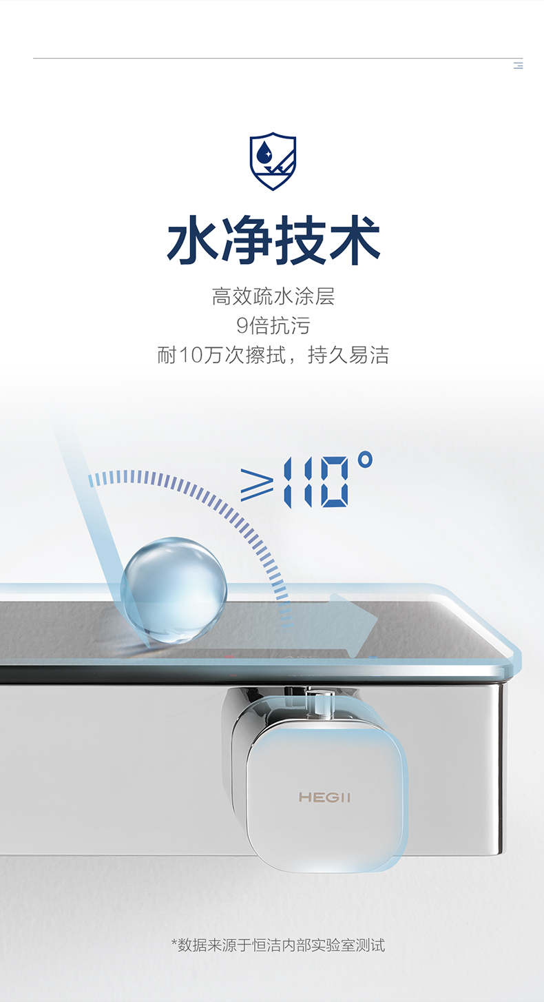 - 恒洁水净技术,高效疏水,9 倍抗污, 10万次擦拭持久易洁