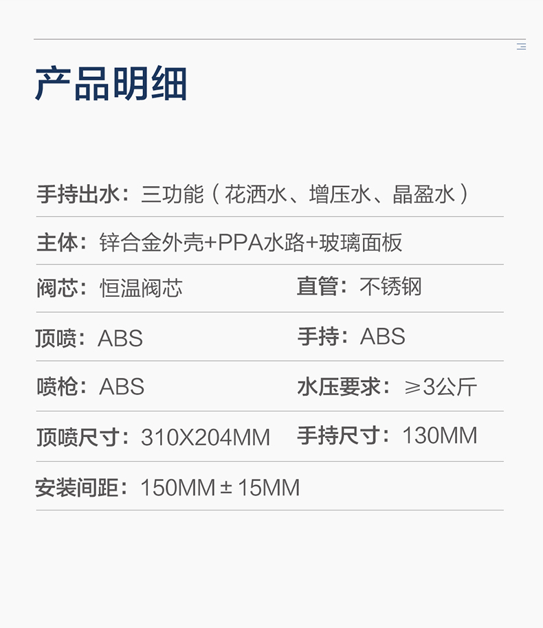 - 恒温防烫技术,控温快准稳,最快0.2s响应, 最小 0.5℃水温波动