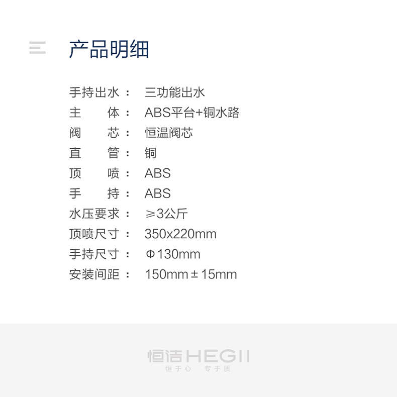 - Φ130mm大面板手持,三种淋浴体验,多重享受