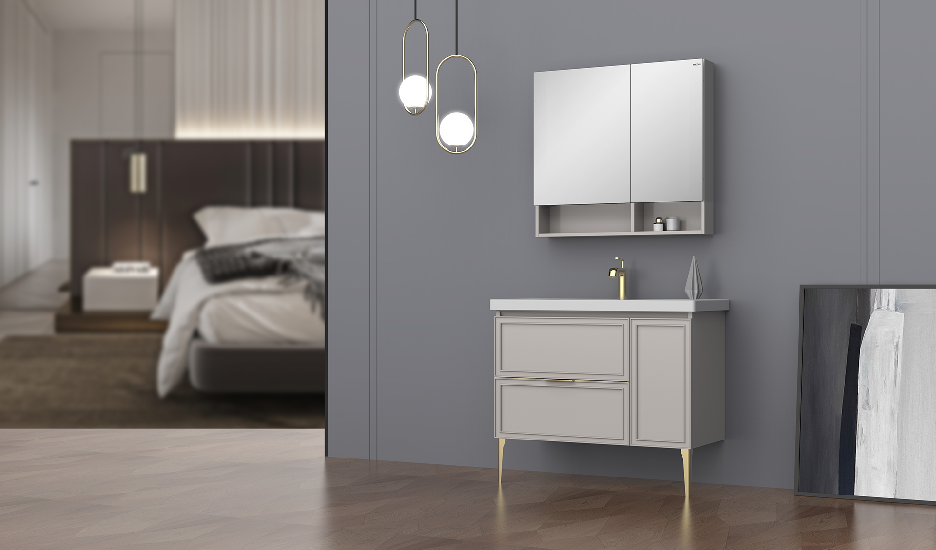 铝合金镜柜,防潮防霉,坚固耐用;柜身生态木,免漆环保,抽面/门板四周使用铝型材立体边框