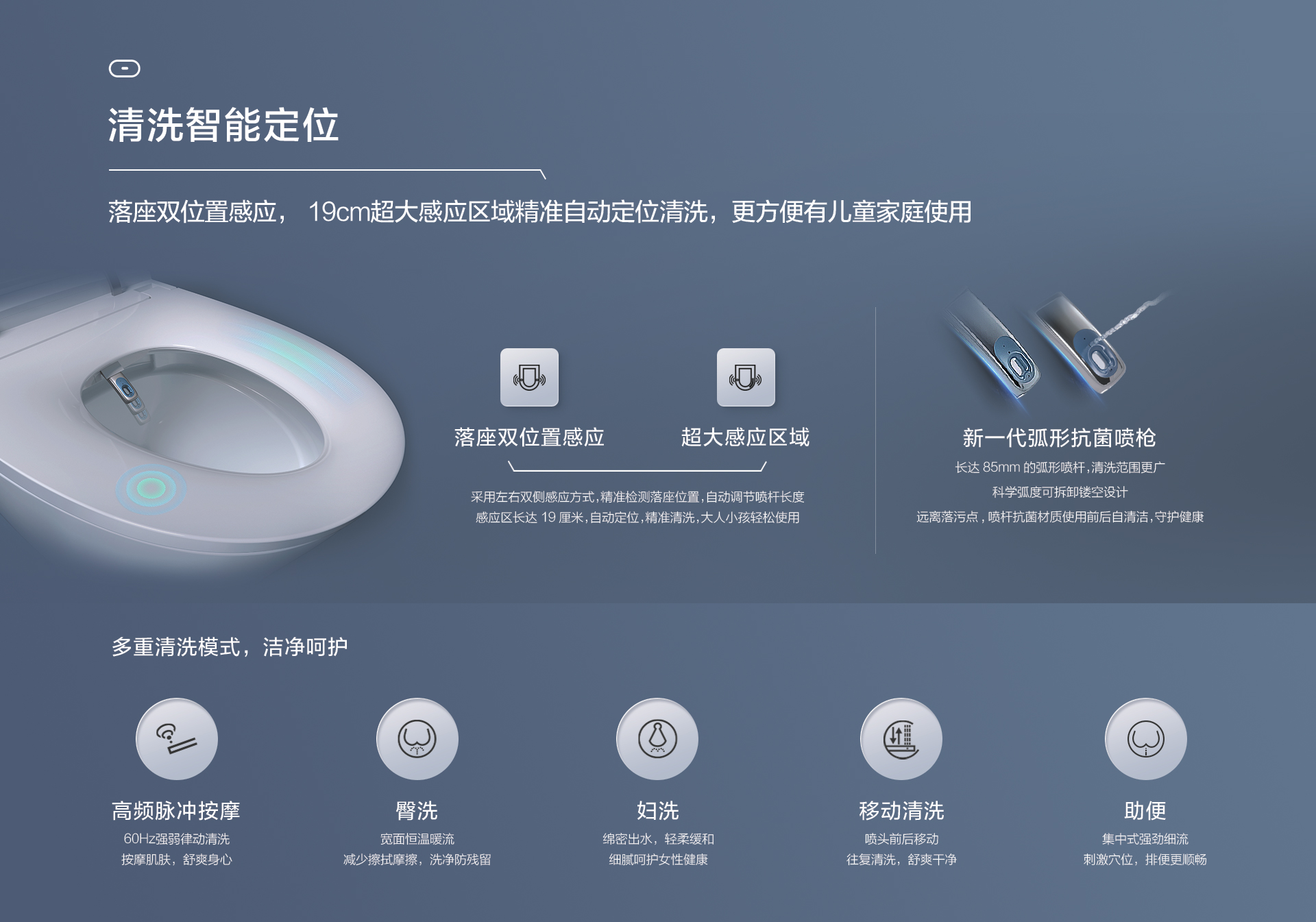 清洗智能定位:落座双位置感应,19cm超大感应区域,精准自动定位清洗,更方便有儿童家庭使用