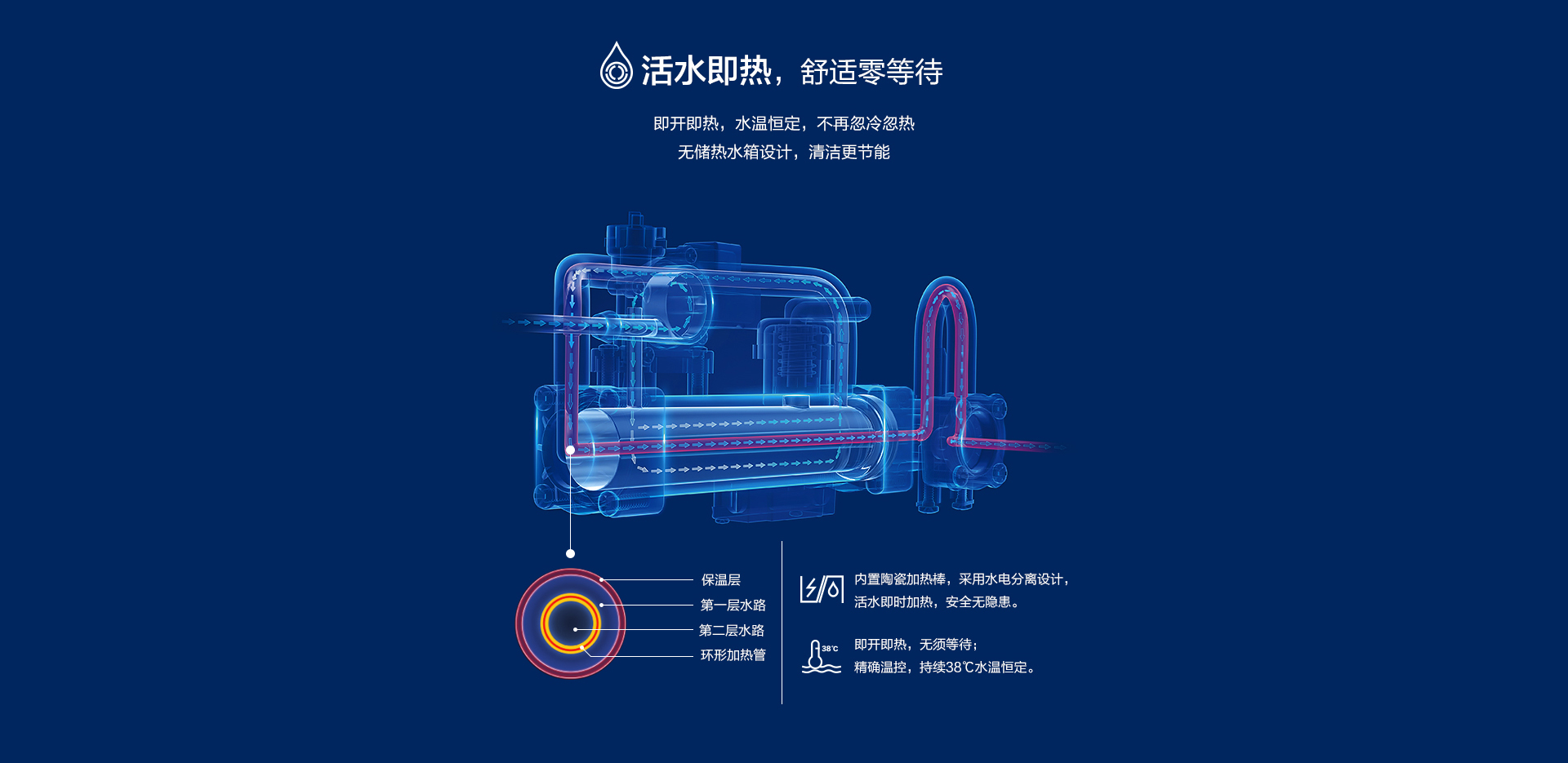 活水即热,瞬间加温,持久恒温