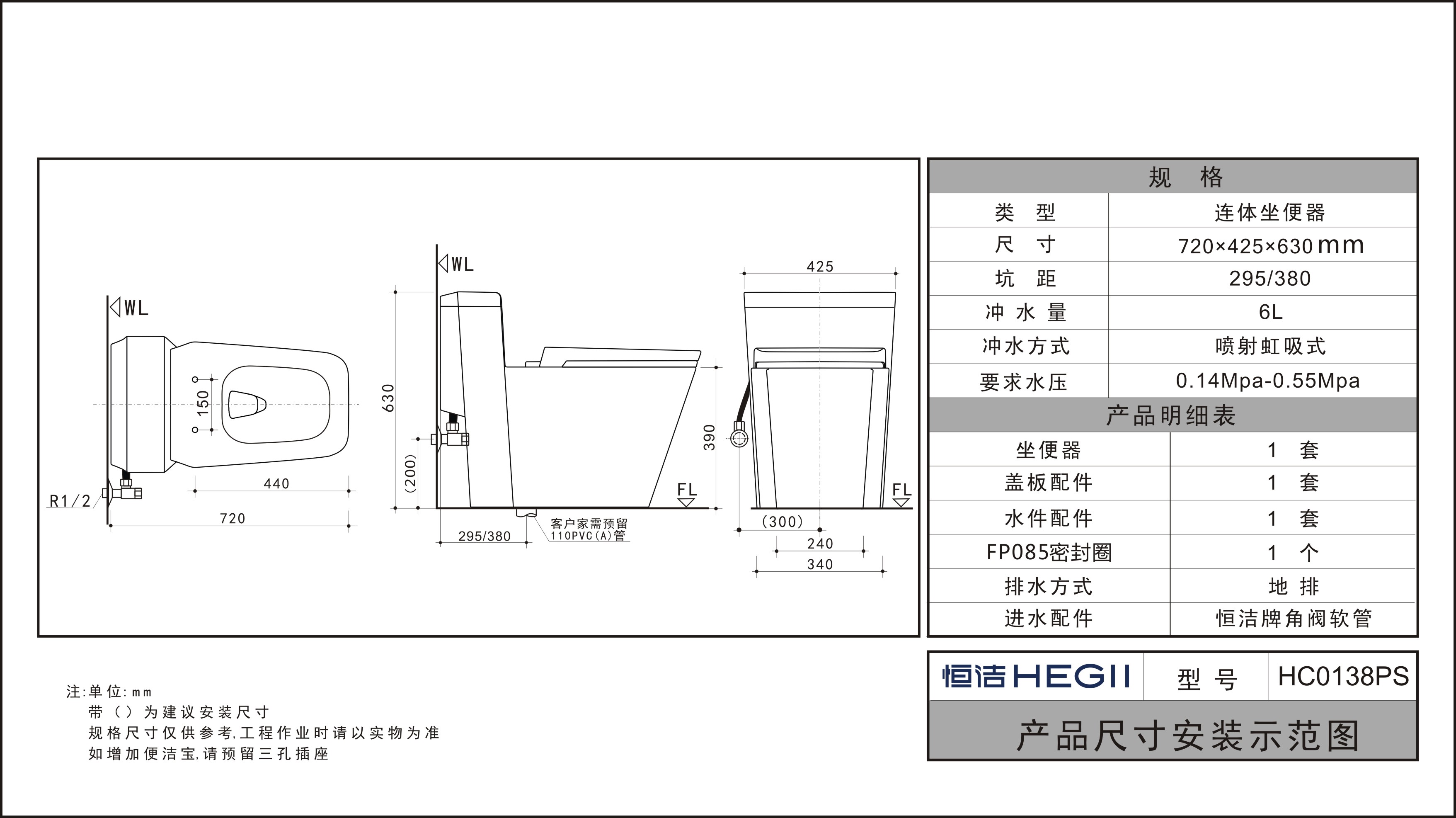 冲水量:6L(侧面单按键)